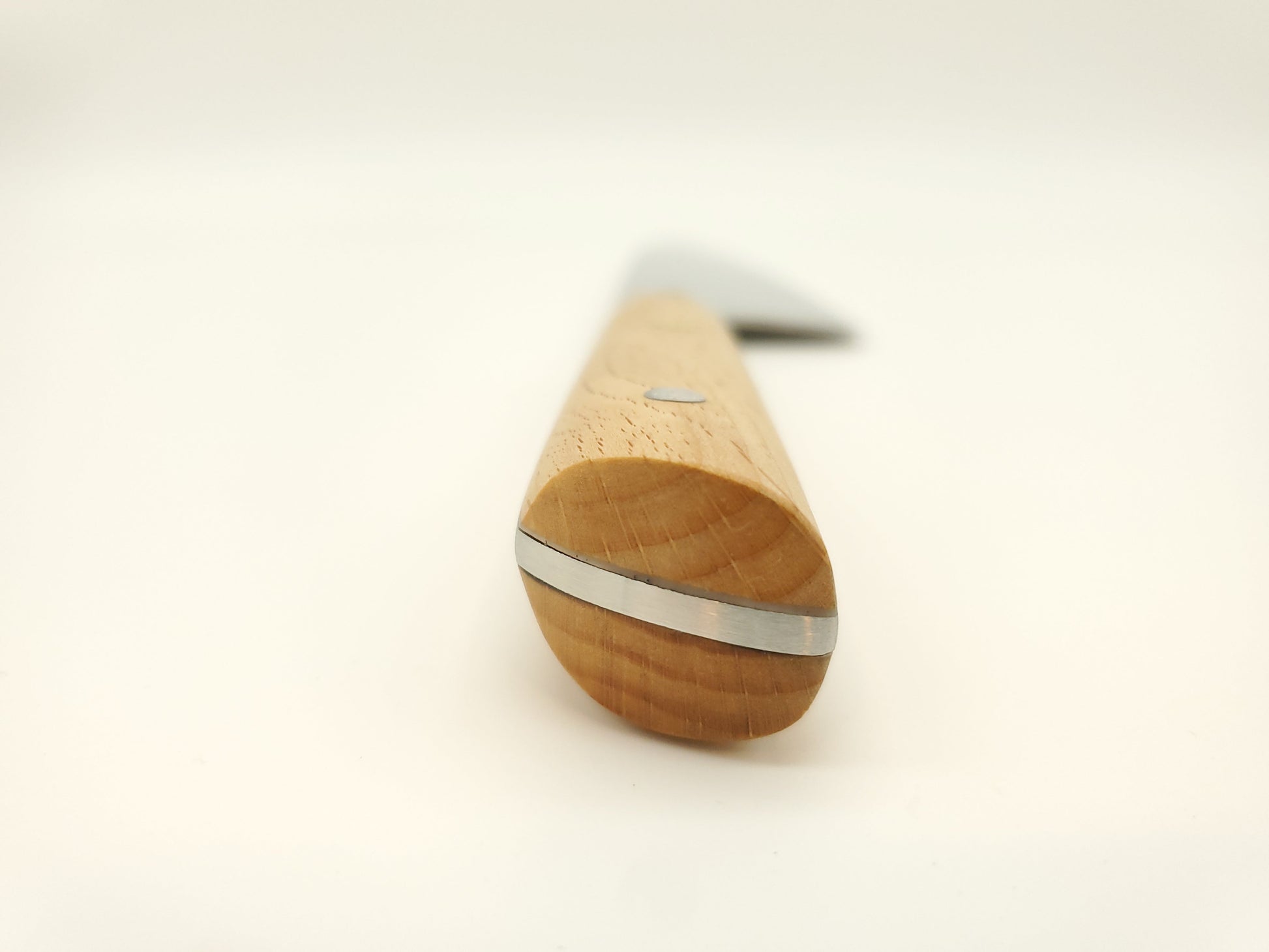 This blade, recently designed by Hazaki Knifes in Montreal, is semi-handcrafted in Japan (small business). The handle, meanwhile, is made by a Montreal cabinetmaker. The blade is particularly thin.