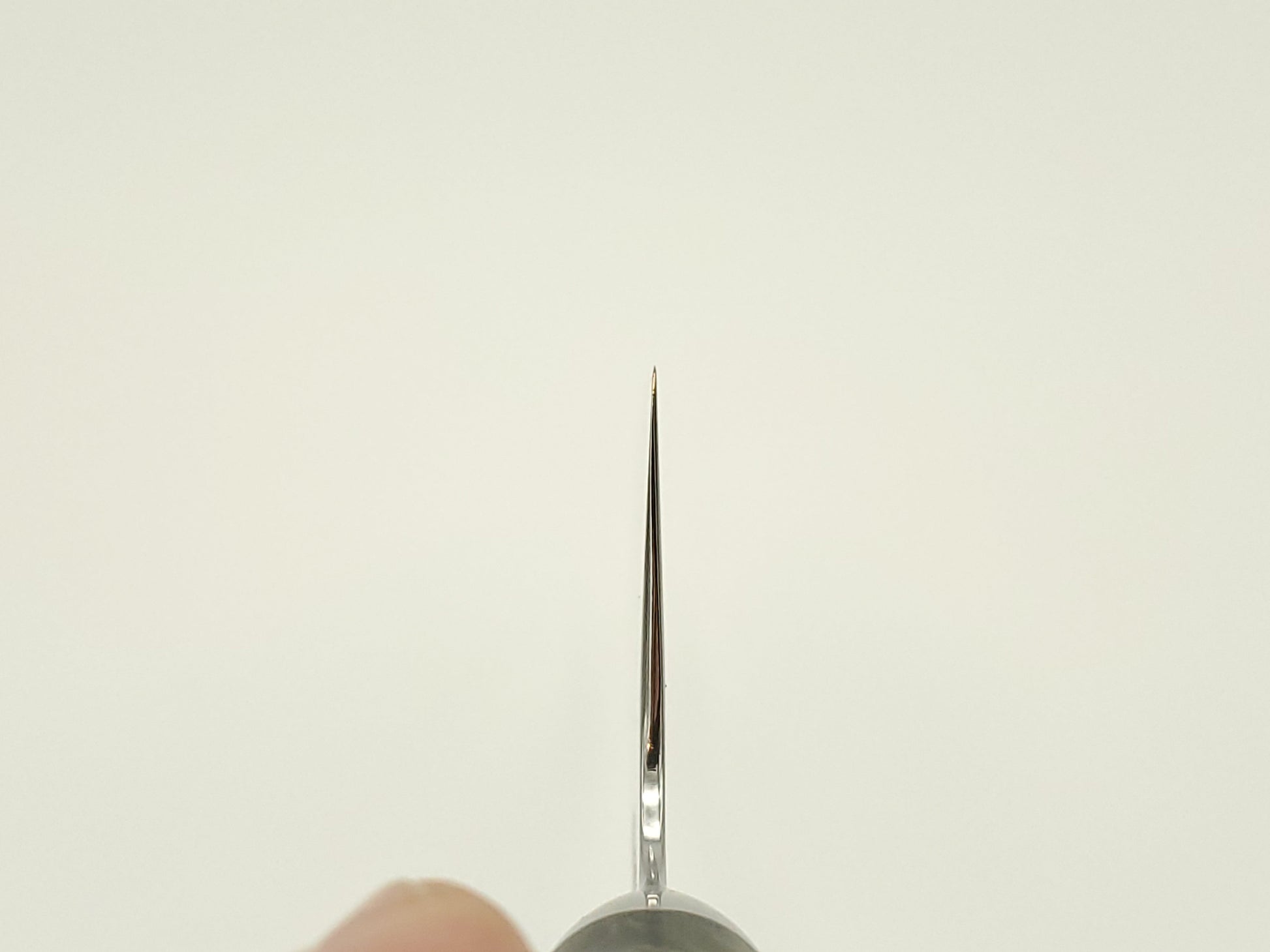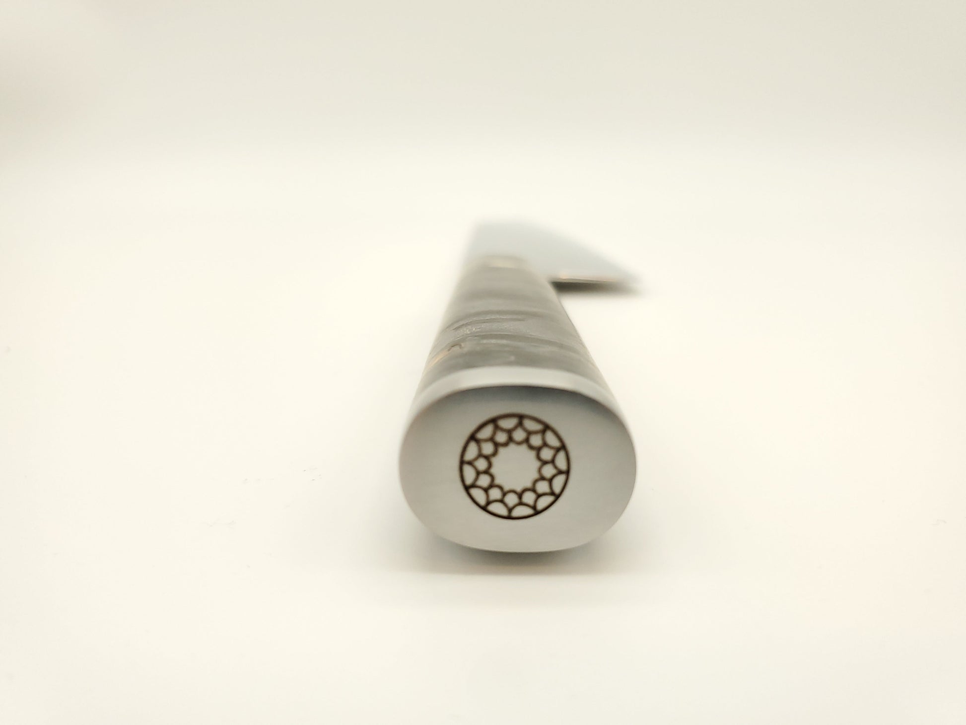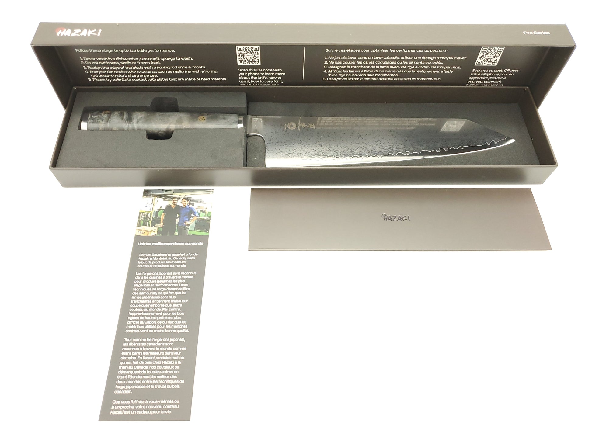 This blade, recently designed by Hazaki Knifes in Montreal, is semi-handcrafted in Japan (small business). The handle is made by a Montreal cabinetmaker. The blade is particularly thin, with a pronounced edge (or secondary angle), making it easier to maintain over time, particularly in terms of thinning. The envelope is composed of 66 layers of low-carbon steel, which facilitates thinning over time. When the Aiguisoir sells a knife, it should come back for maintenance every year for decades to come! That's why L'Aiguisoir is so concerned with the functional aspect of the knives it sells! :-)