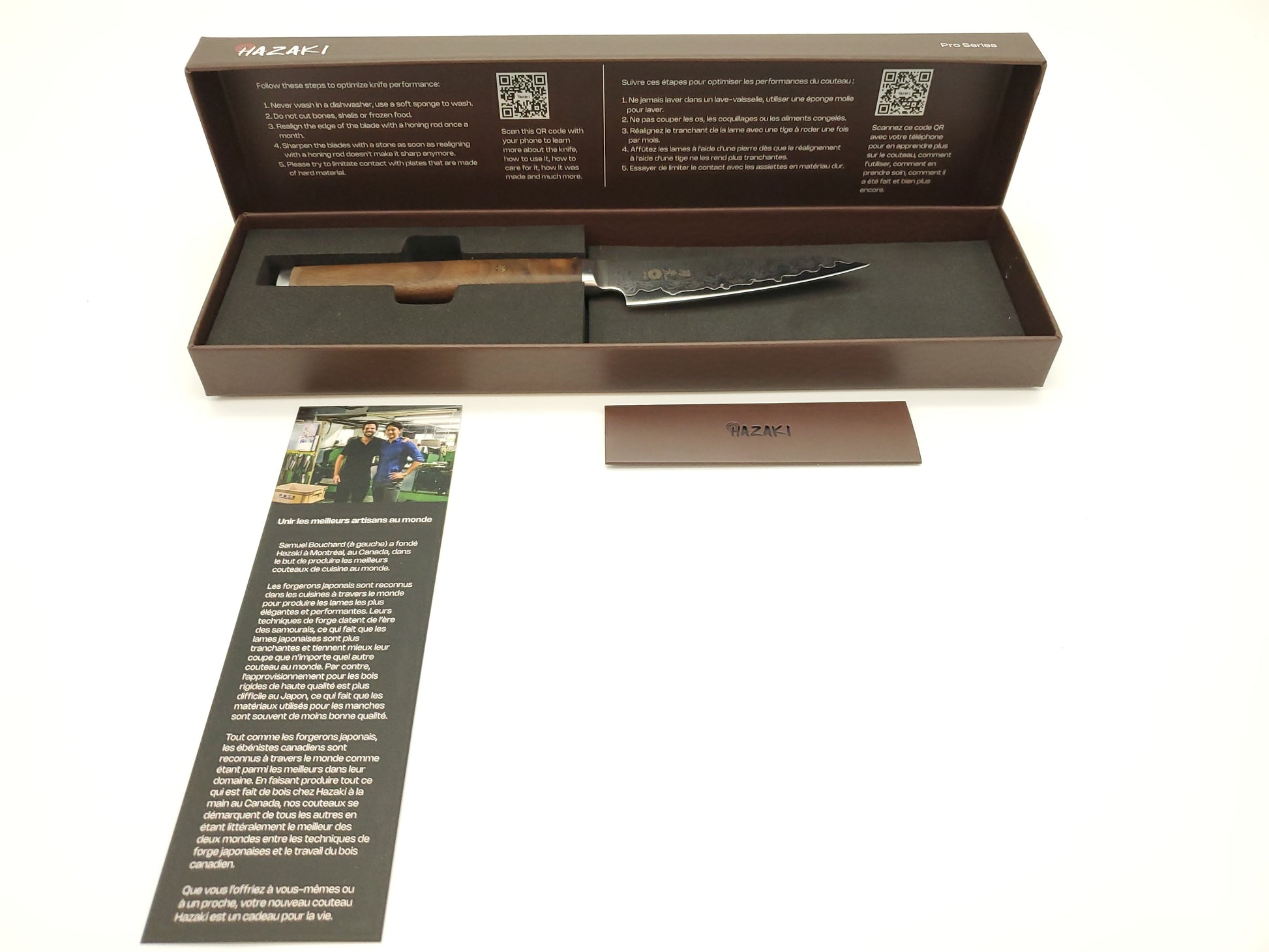 This blade, recently designed by Hazaki Knifes in Montreal, is semi-handcrafted in Japan (small business). The handle is made by a Montreal cabinetmaker. The blade is particularly thin, with a pronounced edge (or secondary angle), making it easier to maintain over time, particularly in terms of thinning. The envelope is composed of 66 layers of low-carbon steel, which facilitates thinning over time. When the Aiguisoir sells a knife, it should come back for maintenance every year for decades to come! That's why L'Aiguisoir is so concerned with the functional aspect of the knives it sells! :-)